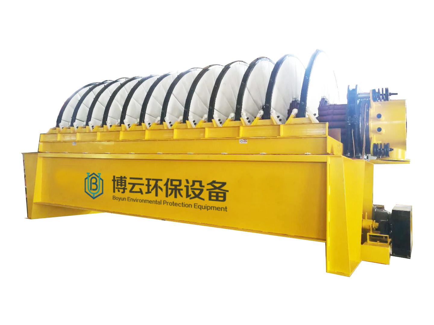 PG系列盤式真空過濾機(jī) (1)扇形濾板脫水孔分布均勻,孔率合理,筋條尺寸大,由高強(qiáng)度工程塑料制成,壽命提高了2-3倍。 (2)濾液管過濾數(shù)面大,分配頭腹腔容積大,提高了抽氣率和濾液排放效果。 (3)耐磨錦綸、單或復(fù)絲濾布使脫餅率高且不易堵塞,使用壽命長(zhǎng)。 (4)多點(diǎn)干油泵集中多點(diǎn)自動(dòng)潤(rùn)滑。 (5)濾布自動(dòng)清洗裝置,保持了其良好的脫水效果。 (6)臥式強(qiáng)制高速攪拌、軸端采用橡膠及石墨盤根和水壓差三重密封不漏漿。 (7)主傳動(dòng)無級(jí)變速,依物料的濃度及流量調(diào)節(jié)(交流調(diào)速電機(jī)或變頻器),以求達(dá)到理想的工作效果 。 (8)每盤由20片扇形板組成,加強(qiáng)了過濾過程控制,成餅厚度均勻。 (9)磨擦片采用特制耐磨硼鑄鐵,剛?cè)嵯酀?jì)密封佳,使用壽命達(dá)到十年以上。 (10)濾液管為高強(qiáng)度耐磨陶瓷復(fù)合鋼管,提高壽命10倍以上。 (11)濾液管與濾扇接口去掉下法蘭,采取模具定位直接焊接,減少了90%可能的漏氣點(diǎn)。