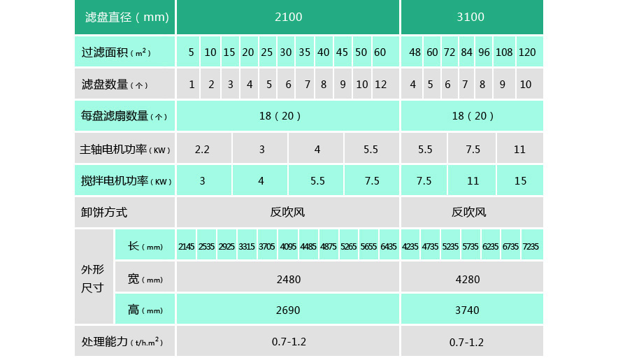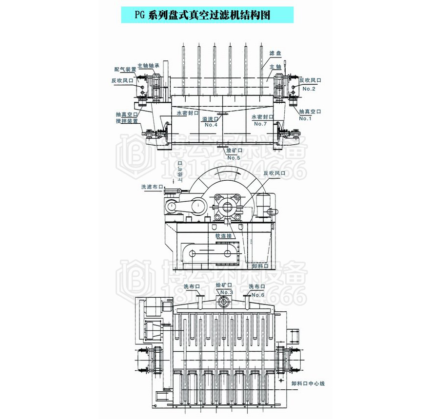 PG系列盤式真空過濾機 (1)扇形濾板脫水孔分布均勻,孔率合理,筋條尺寸大,由高強度工程塑料制成,壽命提高了2-3倍。 (2)濾液管過濾數(shù)面大,分配頭腹腔容積大,提高了抽氣率和濾液排放效果。 (3)耐磨錦綸、單或復絲濾布使脫餅率高且不易堵塞,使用壽命長。 (4)多點干油泵集中多點自動潤滑。 (5)濾布自動清洗裝置,保持了其良好的脫水效果。 (6)臥式強制高速攪拌、軸端采用橡膠及石墨盤根和水壓差三重密封不漏漿。 (7)主傳動無級變速,依物料的濃度及流量調(diào)節(jié)(交流調(diào)速電機或變頻器),以求達到理想的工作效果 。 (8)每盤由20片扇形板組成,加強了過濾過程控制,成餅厚度均勻。 (9)磨擦片采用特制耐磨硼鑄鐵,剛?cè)嵯酀芊饧?,使用壽命達到十年以上。 (10)濾液管為高強度耐磨陶瓷復合鋼管,提高壽命10倍以上。 (11)濾液管與濾扇接口去掉下法蘭,采取模具定位直接焊接,減少了90%可能的漏氣點。